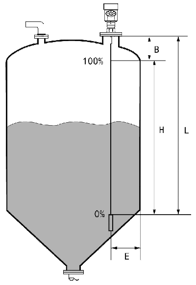 H----測量范圍 L----空罐距離 B----頂部盲區(qū) E----探頭到罐壁的最小距離